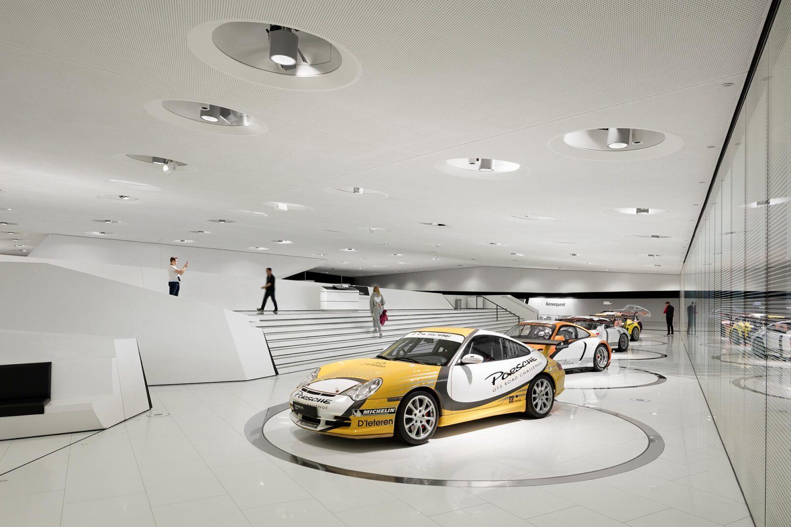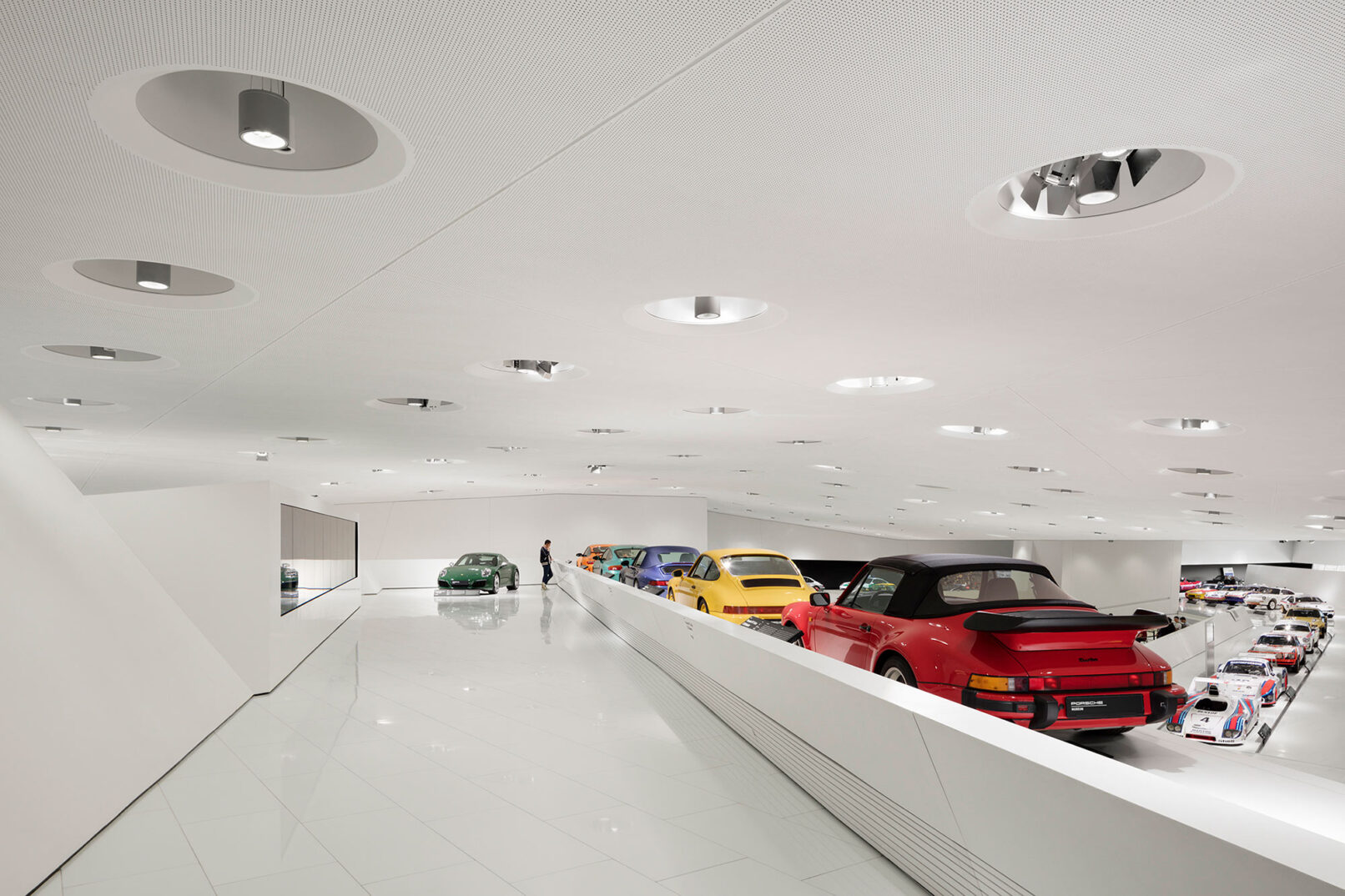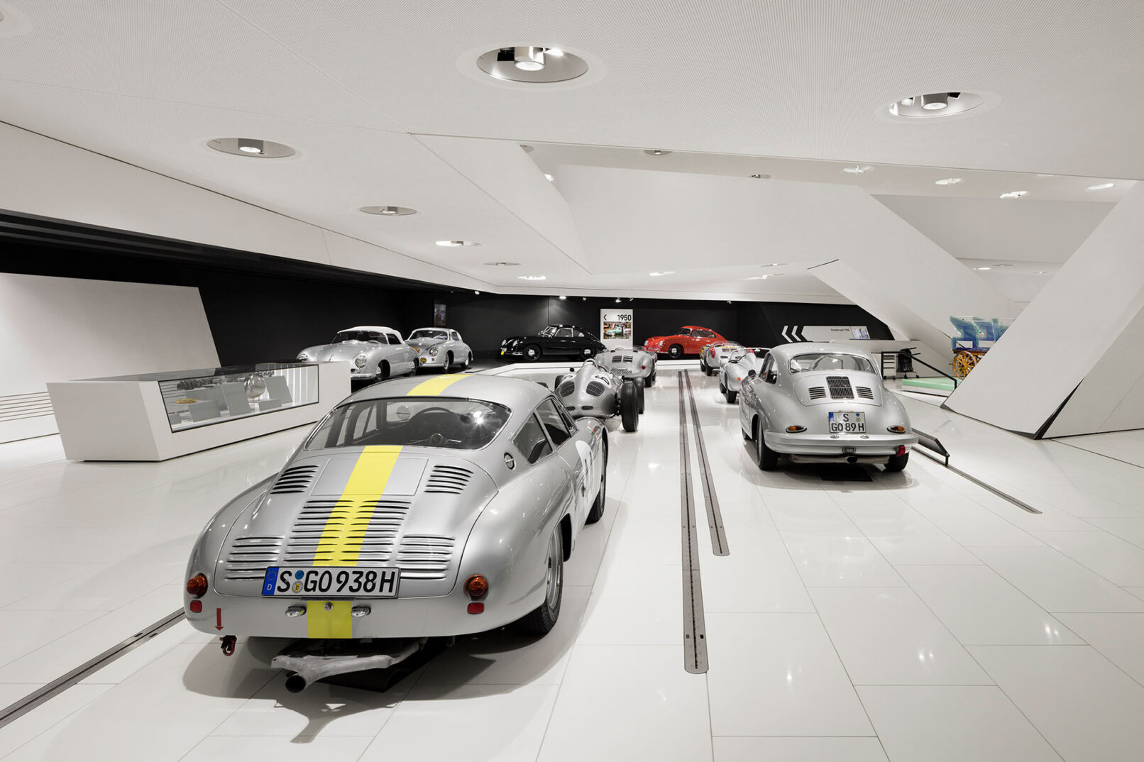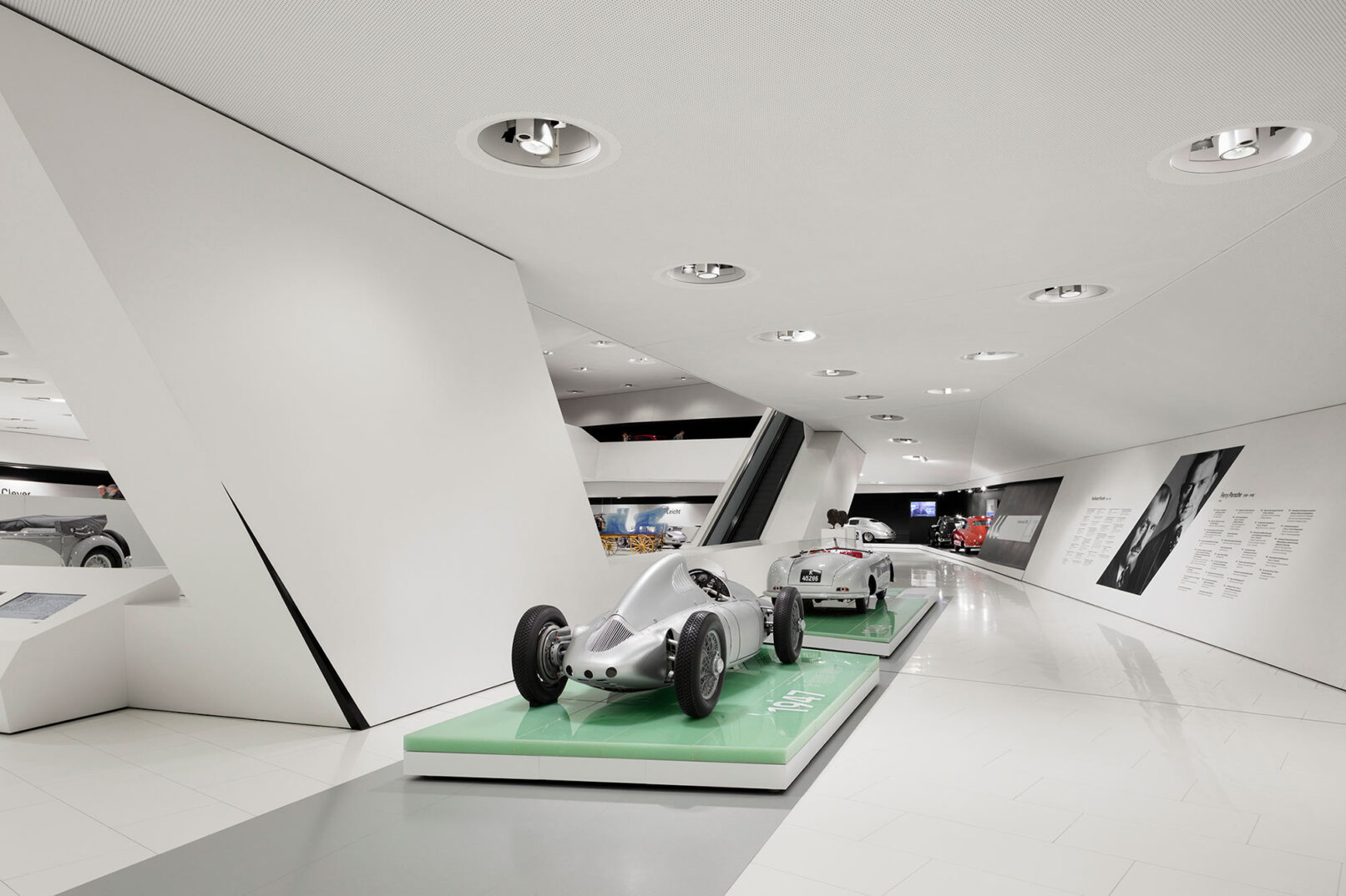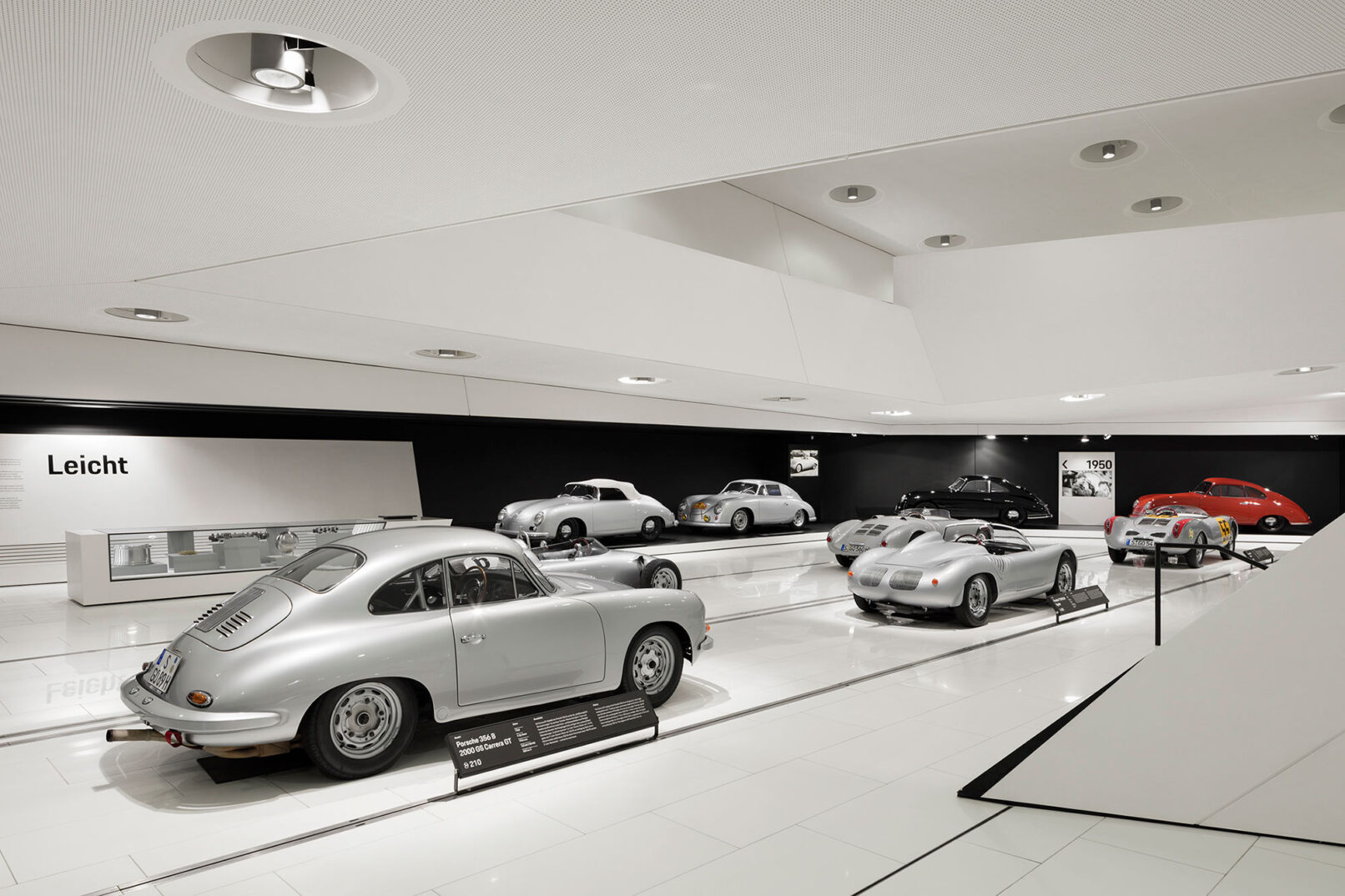 Im Stuttgarter Stadtteil Zuffenhausen wurde 2009 das Porsche Museum nach 4 Jahren Bauzeit eröffnet. Die architektonische Gestaltung des spektakulären Bauwerkes stammt vom Wiener Architekturbüro DMAA – Delugan Meissl Associated Architects. Das Konzept für den musealen Innenausbau wurde vom Stuttgarter Büro HG Merz Architekten entwickelt. Eine Skulptur des englischen Künstlers Gerry Judah entworfen für den Porscheplatz, dient zudem als optischer Fixpunkt für Besucher aus aller Welt. Drei Stelen mit bis zu 24 Metern Höhe tragen jeweils einen Porsche 911 an ihren Spitzen. Mit regelmäßig wechselnden Sonderausstellungen begeistert das Porsche Museum nach wie vor seine Besucher und lockt jährlich bis zu 450.000 Menschen nach Stuttgart. Ich durfte eine der Ausstellungen dokumentieren, um das Zusammenspiel zwischen Architektur und Automobilbegeisterung zu dokumentieren. Die lebendige Tradition und die Dynamik der Marke Porsche zugleich, sollten in Bildern Ausdruck finden.